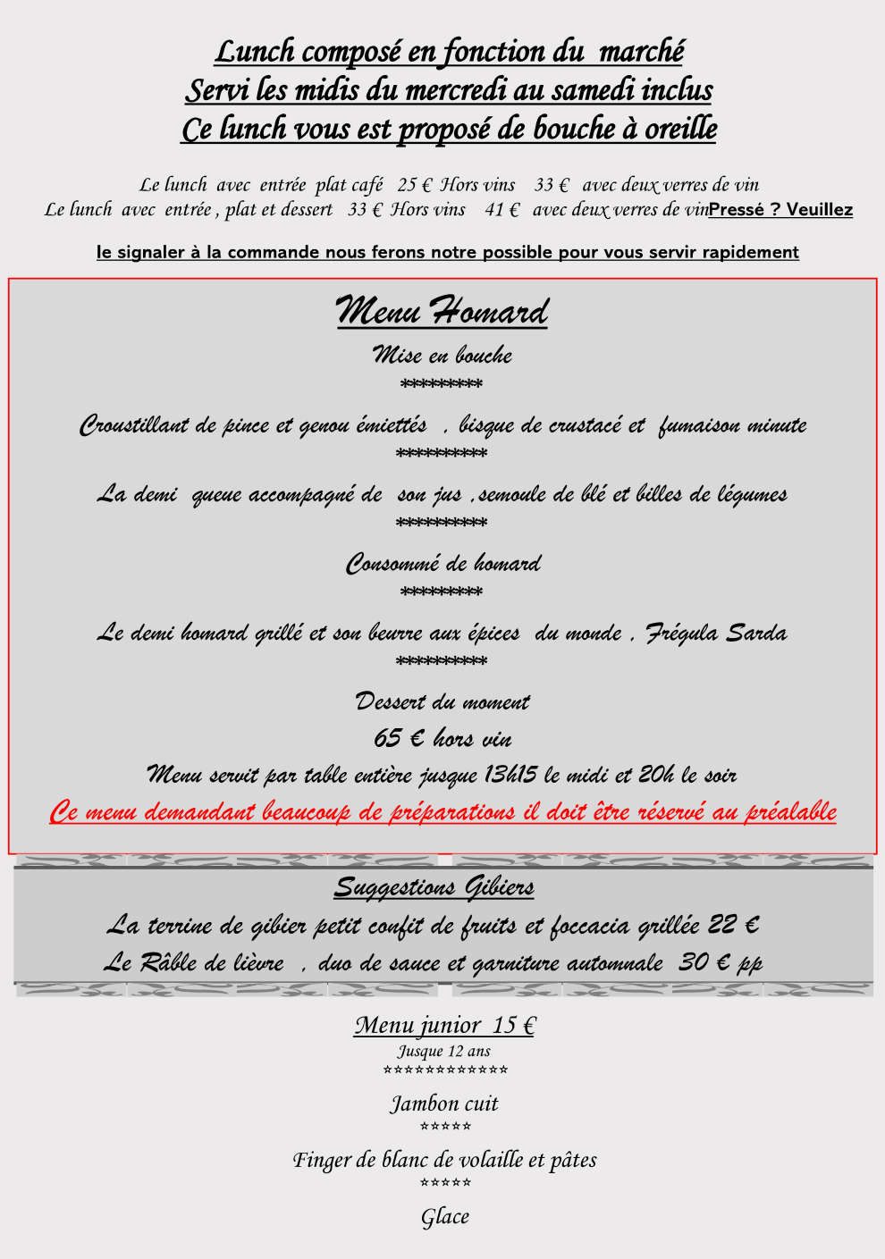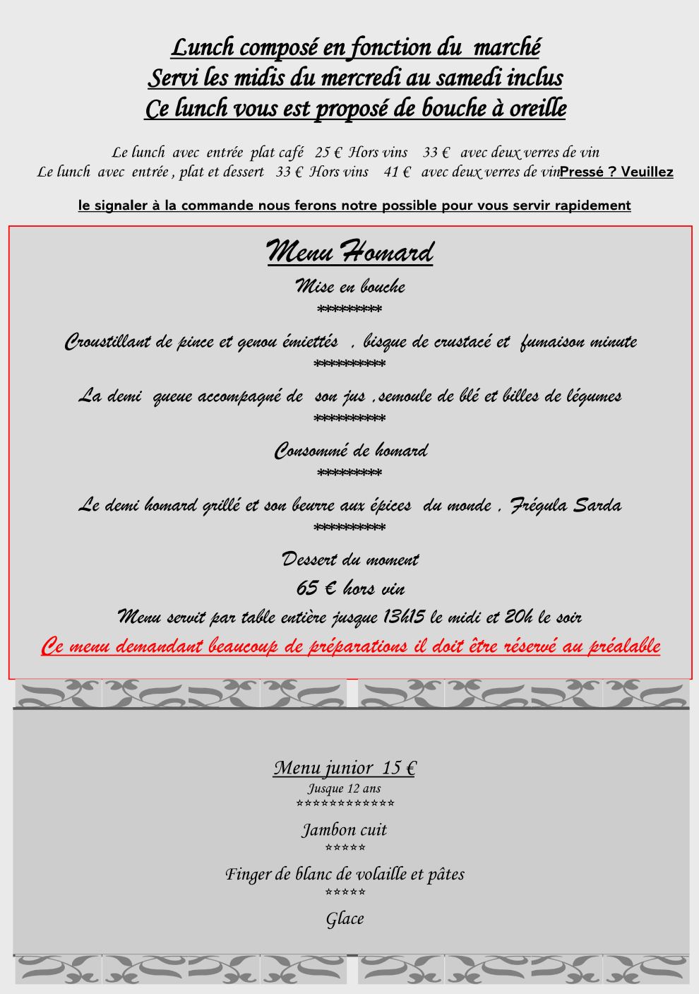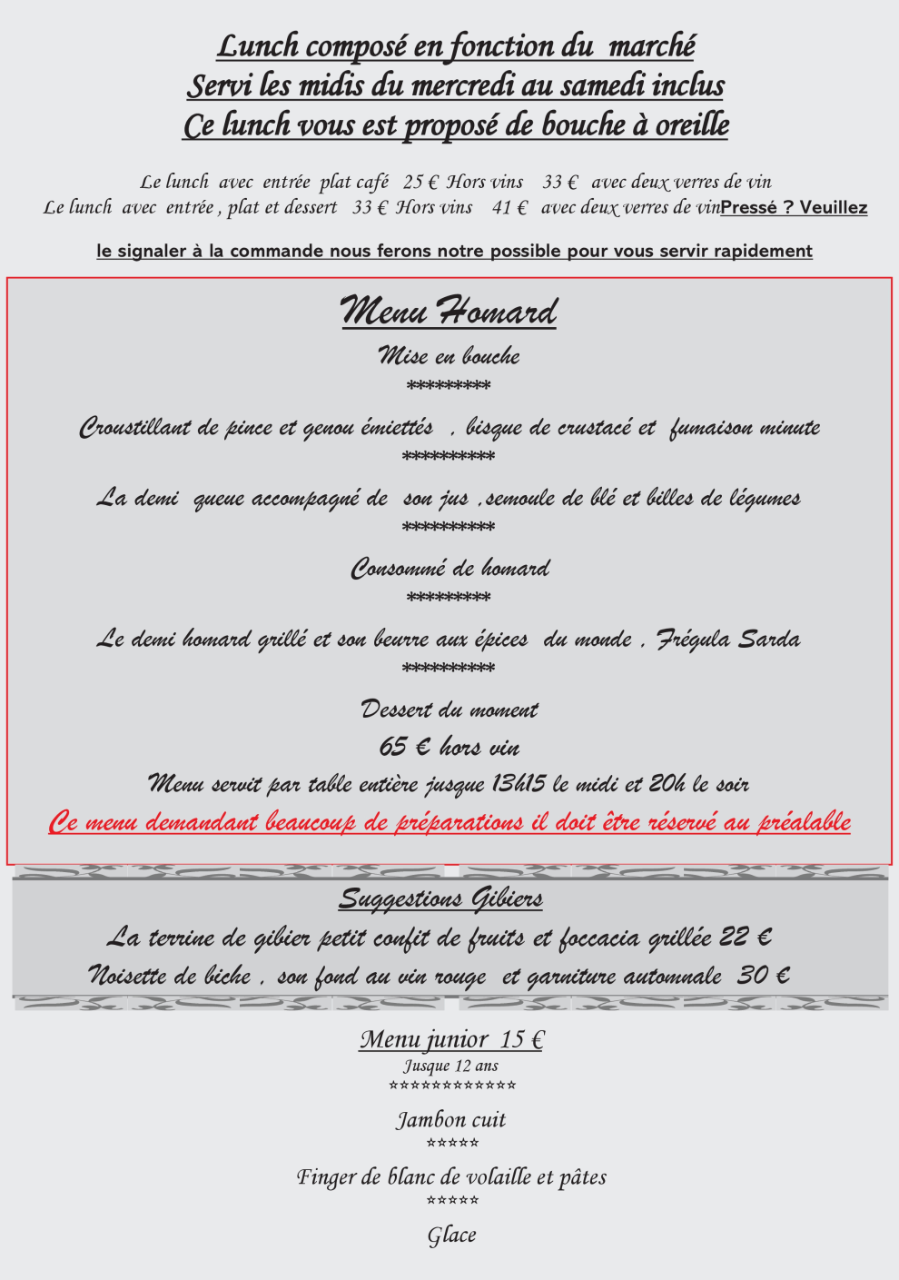 Notre newsletter vous tiendra au courant de toutes nos propositions de menus et cartes, offres spéciales ou événements, …